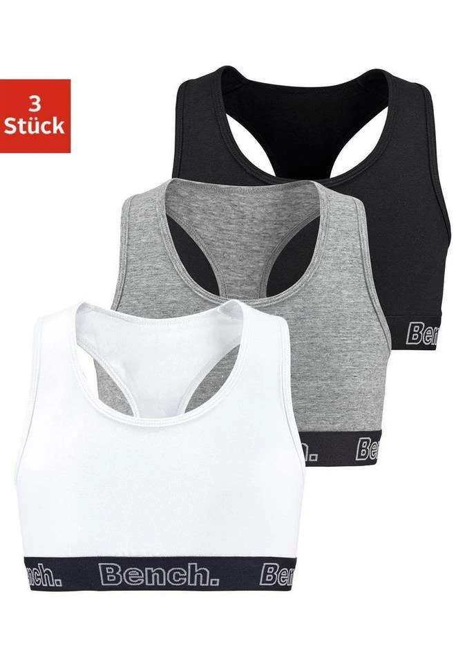 Sportlichkeit trifft Komfort ist das Motto des Bustiers von Bench, das hier gleich im sortierten 3er-Pack auf die Bühne tritt. Optisch besonders gelungen ist das rundum verlaufende Branding auf dem farblich abgesetzten Bündchen. Mit athletischem Ringerrücken und weichem Webbund überzeugt das leichten Halt gebende BH-Top aus Baumwollstretch durch einen gut anliegenden Sitz gepaart mit jeder Menge Bewegungsfreiheit. Für den kompletten Look gibt es auch gleich die passenden Slips und Pantys. Das Wäschefach wartet schon auf das Bustier von Bench im 3er-Set.