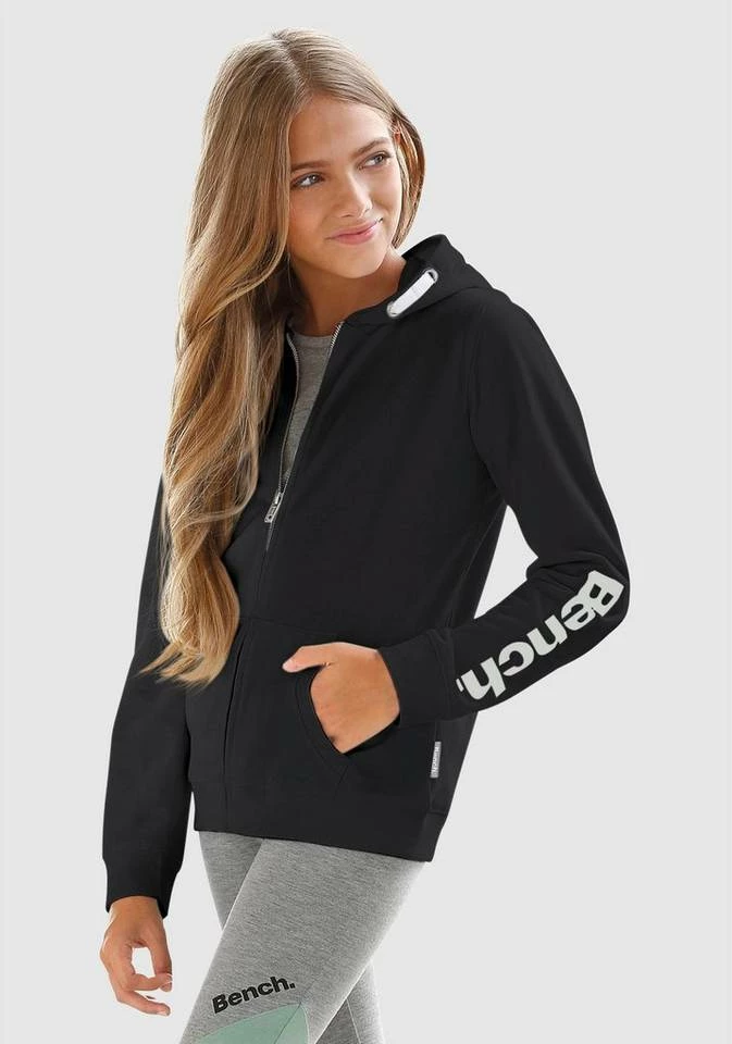 Sportliches Freizeitbasic – die Kapuzensweatjacke von Bench! Die gerade geschnittene Mädchenjacke bringt sich mit sportlichem Charme in die heimische Garderobe ein. Für Eyecatchermomente sorgt der auffällige Ärmeldruck. Geteilte Kängurutasche, durchgehender Metallreißverschluss und elastische Rippbündchen dürfen bei einem klassischen Zip-Hoodie nicht fehlen. Die weiche Sweatware aus trageangenehmer Baumwolle erhebt die Jacke ganz schnell zum neuen Lieblingsbegleiter für bequeme Relaxstyles. Aber auch auf dem Weg zum Sport kommt die Kapuzensweatjacke von Bench gerne zum Einsatz!
