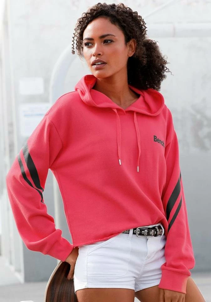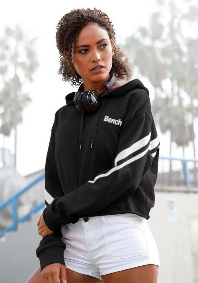 Zwischen Fitnessstudio und Freizeit setzt du auf das sportliche Sweatshirt von Bench. Das unifarbene Design des kurzen Shirts wird von kontrastfarbenen Streifen durchbrochen. Die Eyecatcher verzieren die Rückseite und die langen Ärmel des legeren Sweaters. Ebenfalls im Kontrast-Look gehalten: der kleine Logoprint auf der Brust. Die große Kapuze und der praktische Kordelzug runden den innen angerauten Hoodie cool ab. Jogginghose oder Jeans? Kombiniere das Sweatshirt von Bench je nach Lust und Laune. Aus 60% Baumwolle, 40% Polyester.