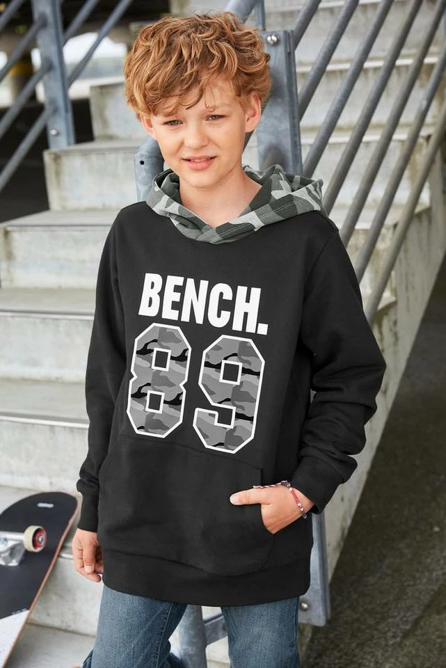 Ob Mode-Blogger oder nicht — dieses Kapuzensweatshirt »Kapuze tarnfarben gemustert« der Marke Bench. finden alle Jungs stylisch. Es wirkt mit dem Aufdruck stylisch und cool. Die Ärmel enden in einem Rippbündchen. Es ist basic geschnitten, sodass die Bewegungsfreiheit nicht leidet. Mit der Kängurutasche, die vorne am Bauch aufgenäht ist, ist der bequeme Hoodie-Look komplett.