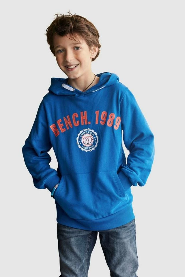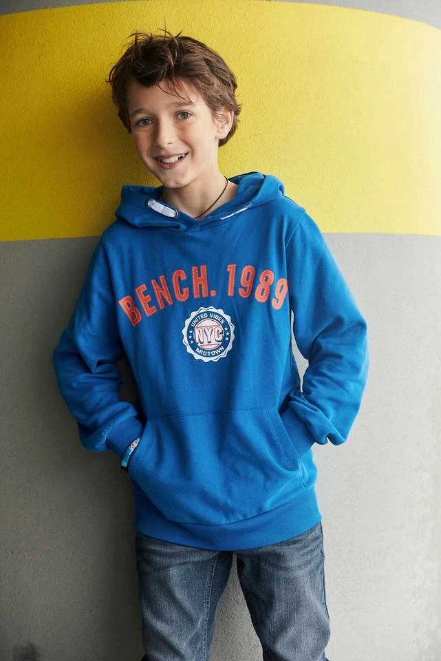 Ob Mode-Blogger oder nicht — dieses Kapuzensweatshirt der Marke Bench. finden alle Jungs stylisch. Es wirkt mit dem Aufdruck stylisch und cool. Die Ärmel enden in einem Rippbündchen. Es ist basic geschnitten, sodass sich Teenies frei bewegen können. Die vorne am Bauch aufgenähte Kängurutasche macht den bequemen Hoodie-Look komplett.