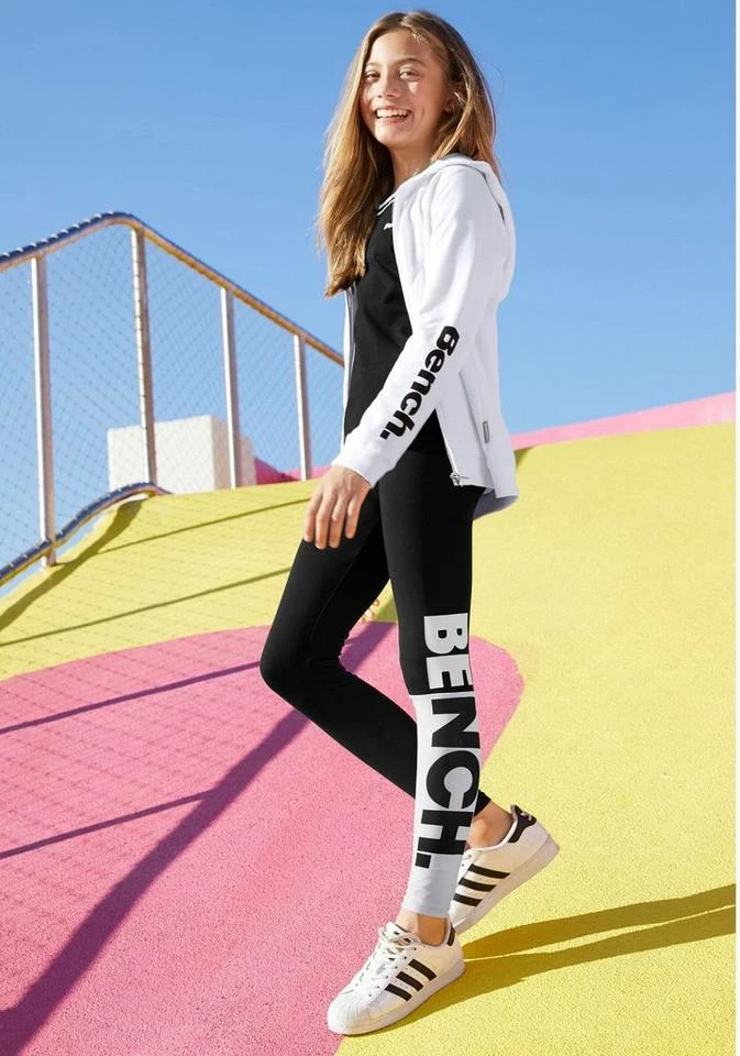 Applaus für diese schicken Leggings von Bench. Die schmale Jerseyhose fällt dank des Logoprints am Bein sofort ins Auge. Dafür sorgt auch der zweifarbige Colorblocking-Look, der richtig stylisch ist. Der elastische Bund mit Tunnelzug bietet einen guten Sitz – genau wie die elastische Stoffqualität, die die Mädchenleggings superangenehm macht. Zusammen mit einem T-Shirt mit Fledermausärmeln kommt die Mädchenhose richtig groß raus. Ein echter Tipp für stilbewusste Mädchen: die Leggings von Bench.