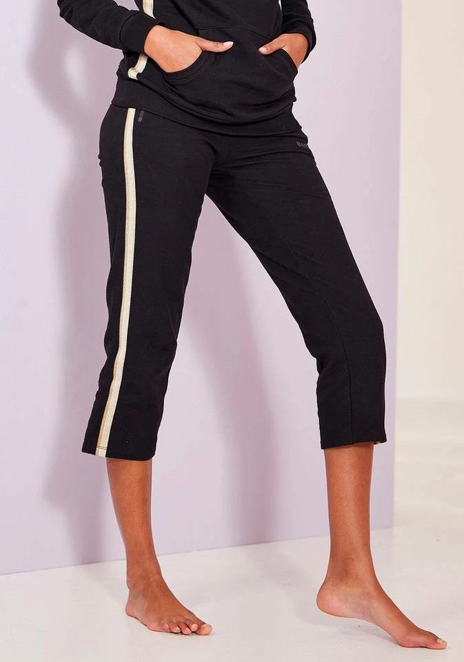 Sweathosen in Capri-Länge sind die perfekten Begleiter für warme Temperaturen und lässige Freizeitoutfits. Diese Capripants von Bench haben einen sportlichen Charakter, sind aber genauso geeignet für gemütliche Stunden daheim auf der Couch. Oder vielleicht arbeitest du ja auch im Home-Office und suchst noch nach einem perfekt sitzenden Kleidungsstück. Die Caprihose bietet dir mit ihrem elastischen Baumwollmaterial hervorragende Trageeigenschaften. Optisch begeistert sie mit seitlichen Streifen und in Sachen Komfort setzt das Bündchen mit Kordelzug noch einen Pluspunkt oben drauf. Für die Capripants von Bench gibt es nur eine Bezeichnung: superbequem!