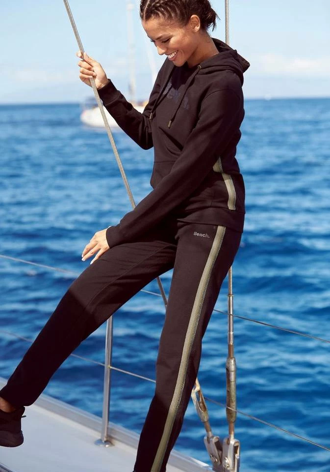 Diese tolle Relaxhose von Bench hat schon sehnlichst darauf gewartet, dass du den Feierabend einläutest. Mit ihr kannst du dich bequem auf deine Couch lümmeln und es dir so richtig gemütlich machen. Die Jogginghose besteht aus einem weichen Baumwollmaterial, das durch elastische Eigenschaften begeistert. Richtig cool setzt sich das Design mit seinen seitlichen Streifen in Szene und das softe Bündchen ist mit einem praktischen Kordelzug ausgestattet. Ergänzt wird die Hose durch eine angenehme Passform und gerade geschnittene Beine. Rein in die Relaxhose von Bench und rauf aufs Sofa!