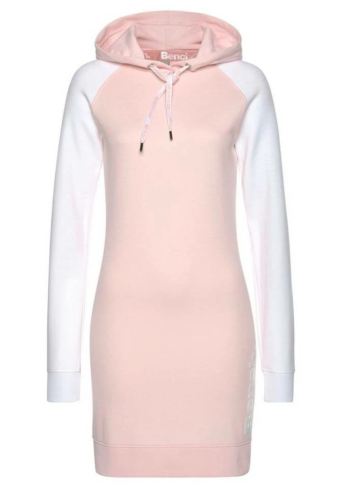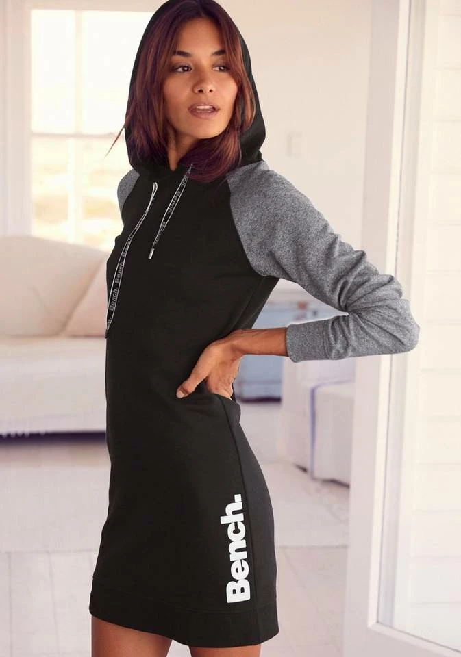 Eine gekonnte Mischung von Gemütlichkeit und Weiblichkeit stellt das Sweatkleid von Bench dar. Das Kleid ist aus einer angenehmen Baumwoll-Polyester-Mischung gefertigt und weiß durch seinen Tragekomfort zu überzeugen. Neben einer coolen Kapuze mit Kordelzug überzeugt es auch durch Rippbündchen an Saum und Ärmeln. Besonders markant ist der Logodruck, der sowohl seitlich als auch auf den Kordeln zu finden ist. Mit einer Strumpfhose oder Leggings ist schnell ein toller Look um das Sweatkleid von Lascana gefunden, der nicht nur auf der Couch, sondern auch auf langen Reisen überzeugen kann.