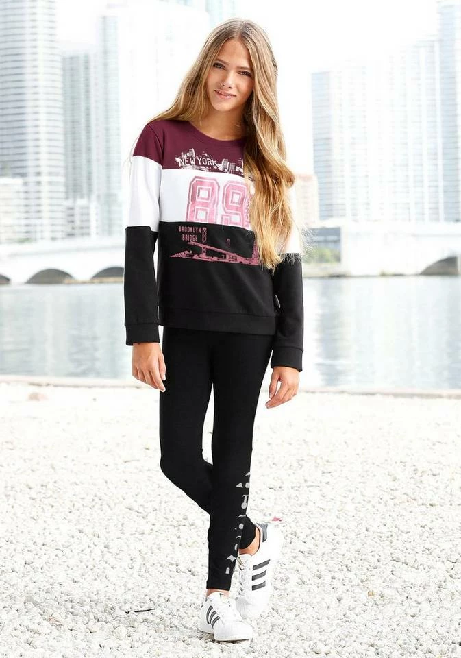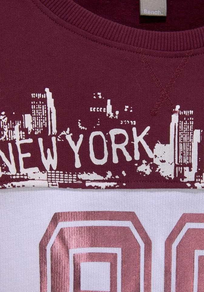 Mit dem Design in Blockoptik garantiert di dieses schöne Sweatshirt von Bench für Mädchen einen coolen Auftritt. Vorn ist das Modell mit großen Motiven bedruckt. Der größte Eyecatcher ist dabei sein toller, schimmernder Markenprint aus Glanzfolie. Die bequeme Basicform des leichten Sweaters mit Rundhalsausschnitt sitzt dank elastischer Rippbündchen ideal. Schlichte Jogginghosen und Sneakers ergänzen dein sportliches Freizeitoutfit trendy. Hoher Komfort- und Stylefaktor: das lässige Sweatshirt von Bench für Mädchen!