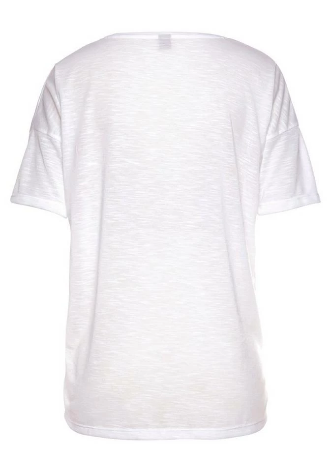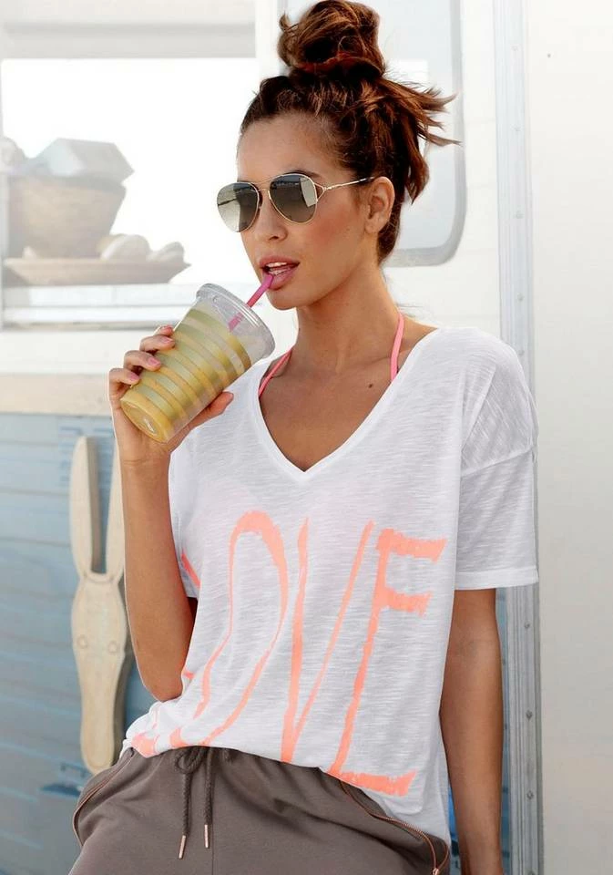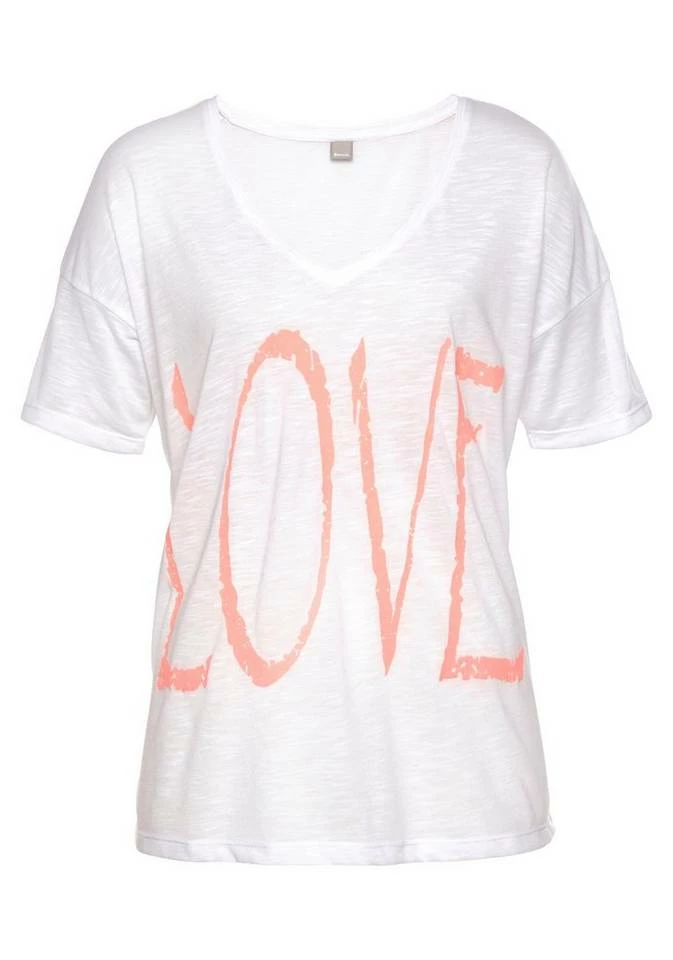 Die perfekte Ergänzung für dein lässiges Strandoutfit! Das Strandshirt von Bench setzt alles daran, um dir bei Sommer, Sonne und Sonnenschein einen trendigen Look zu verpassen. Kurze überschnittene Ärmel, der tiefe V-Ausschnitt und die lockere Passform lassen das Shirt zum idealen Kombiteil für den Bikini werden. Es lässt sich bei Bedarf schnell und unkompliziert überziehen. Auf der Vorderseite macht ein neonfarbener Print auf sich aufmerksam und verleiht dem Damenshirt damit einen coolen Touch. Die weich fließende, leicht transparente Slubware gibt dem Strandshirt von Bench dann noch das gewisse Etwas.