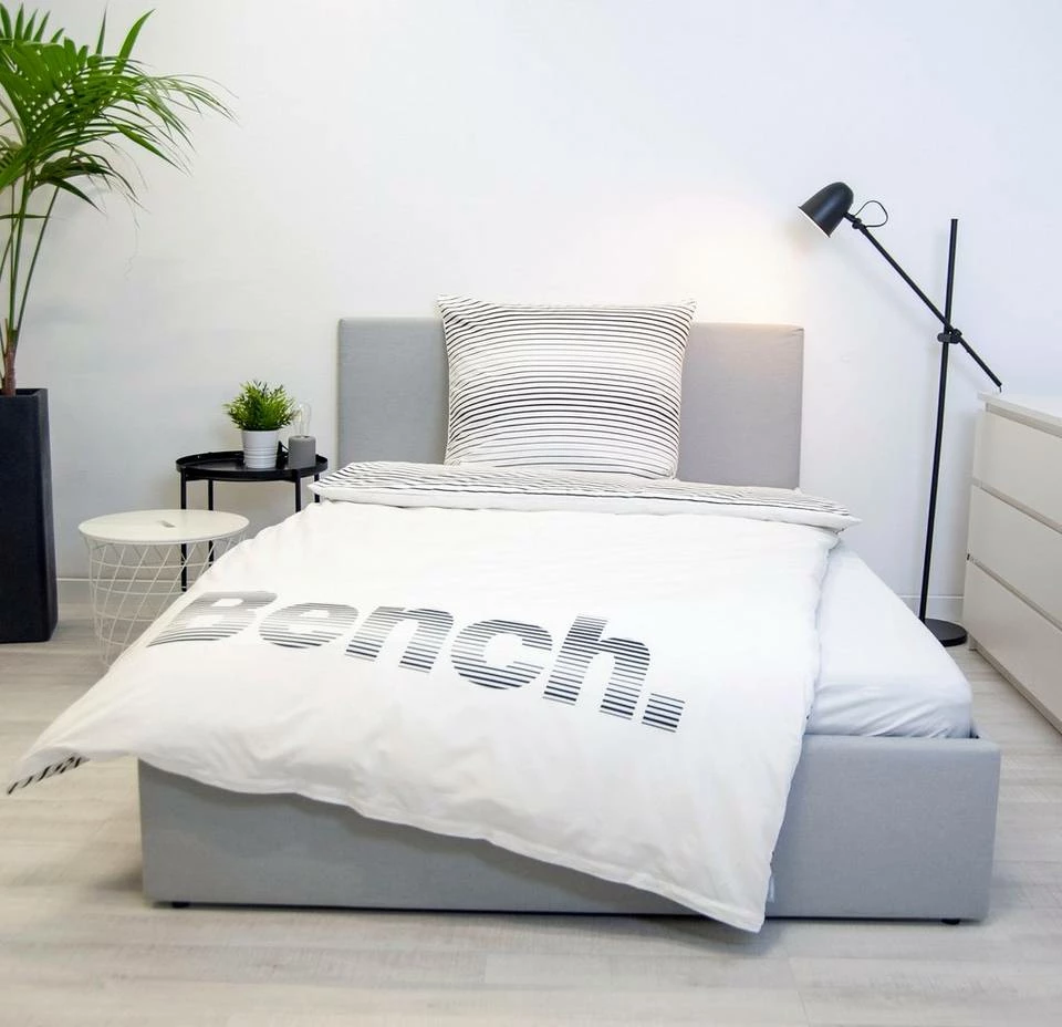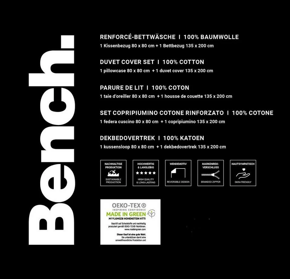 Neben ausgewählten, nachhaltigen Materialien sind sehr gute Arbeitsbedingungen und eine hohe Mitarbeiterzufriedenheit die Grundlage für Qualitätsprodukte. Nur in ausgewählten Fertigungsstätten, die sich der Business Social Compliance Initiative, kurz amfori BSCI, angeschlossen haben, wird dieser Artikel der Bench Home & Living Kollektion hergestellt. Damit nicht genug, der Artikel ist nach MADE IN GREEN by OEKO-TEX® zertifiziert: dies gibt an, dass das Produkt auf Schadstoffe geprüft wurde und darüber hinaus in umweltfreundlichen und sozial verantwortlichen Unternehmen hergestellt wurde. Diese tolle Wendebettwäsche mit einem Bench Schriftzug ist ein absoluter Blickfang und wird Sie begeistern. Durch seine weiche Baumwoll-Qualität ( Renforcé, 100% Baumwolle ) sorgt die Bettwäsche für ein angenehmes Schlafklima. Die Garnitur kann bei 60°C in der Maschine gewaschen und anschließend im Trockner getrocknet werden. Sowohl der Kopfkissenbezug als auch der Bettbezug sind mit einem praktischen Markenreißverschluss ausgestattet. Durch die schöne Wendeoptik des Kissen- und des Bettbezuges passt die Bettwäsche hervorragend in jedes schlafzimmer.