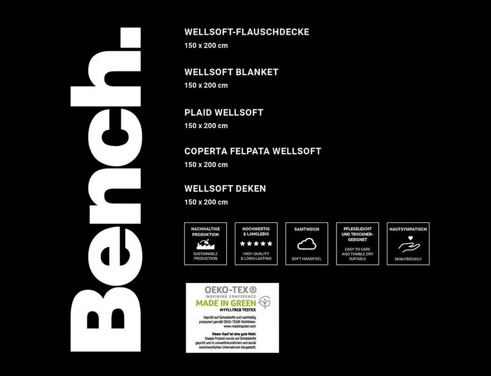 Neben ausgewählten, nachhaltigen Materialien sind sehr gute Arbeitsbedingungen und eine hohe Mitarbeiterzufriedenheit die Grundlage für Qualitätsprodukte. Nur in ausgewählten Fertigungsstätten, die sich der Business Social Compliance Initiative, kurz amfori BSCI, angeschlossen haben, wird dieser Artikel der Bench Home & Living Kollektion hergestellt. Damit nicht genug, der Artikel ist mit STANDARD 100 by OEKO TEX® zertifiziert. Der Zusatz MADE IN GREEN by OEKO-TEX® gibt an, dass das Produkt auf Schadstoffe geprüft wurde und darüber hinaus in umweltfreundlichen und sozial verantwortlichen Unternehmen hergestellt werden. Diese kuschelige und weiche Wellsoft-Decke im modernen Bench Design mit Schriftzg wird Sie begeistern. Dank der angenehm weichen und strapazierfähigen Qualität ( 100% Polyester – Flanell Fleece ) läd sie einfach zum Einkuscheln und Wohlfühlen an kühlen Abenden ein. Bei Bedarf kann die Decke bei 40°C in der Maschine gewaschen und im Trockner getrocknet werden.